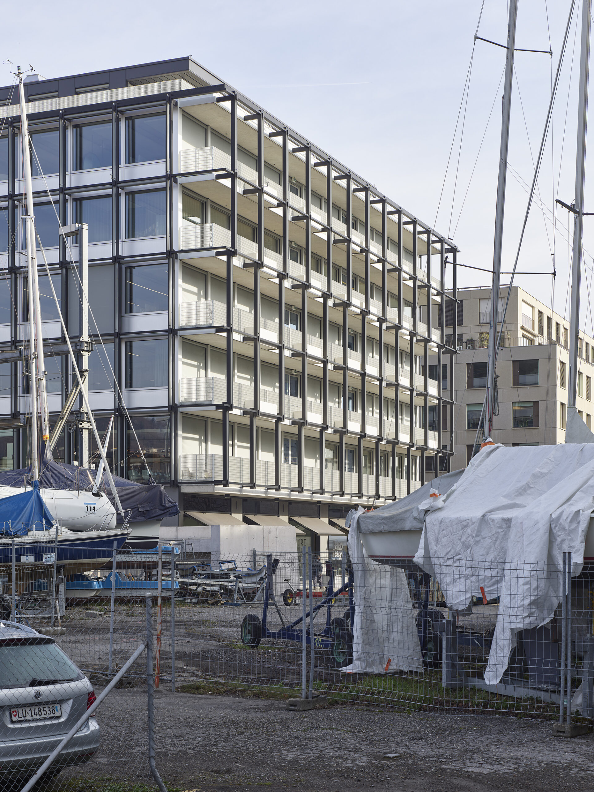 Durch den Verzicht auf eine Komfortlüftung können dünne Deckenstärken realisiert, und mit dem Entscheid, autofreies Wohnen umzusetzen, kann das Untergeschoss kompakt gehalten und der Einsatz von Beton im ganzen Projekt minimiert werden. Zusammen mit der Einplanung, eines hinterlüfteten Fassadensystems, können auf diese Weise wichtige Punkte bezüglich Nachhaltigkeit umgesetzt werden.
