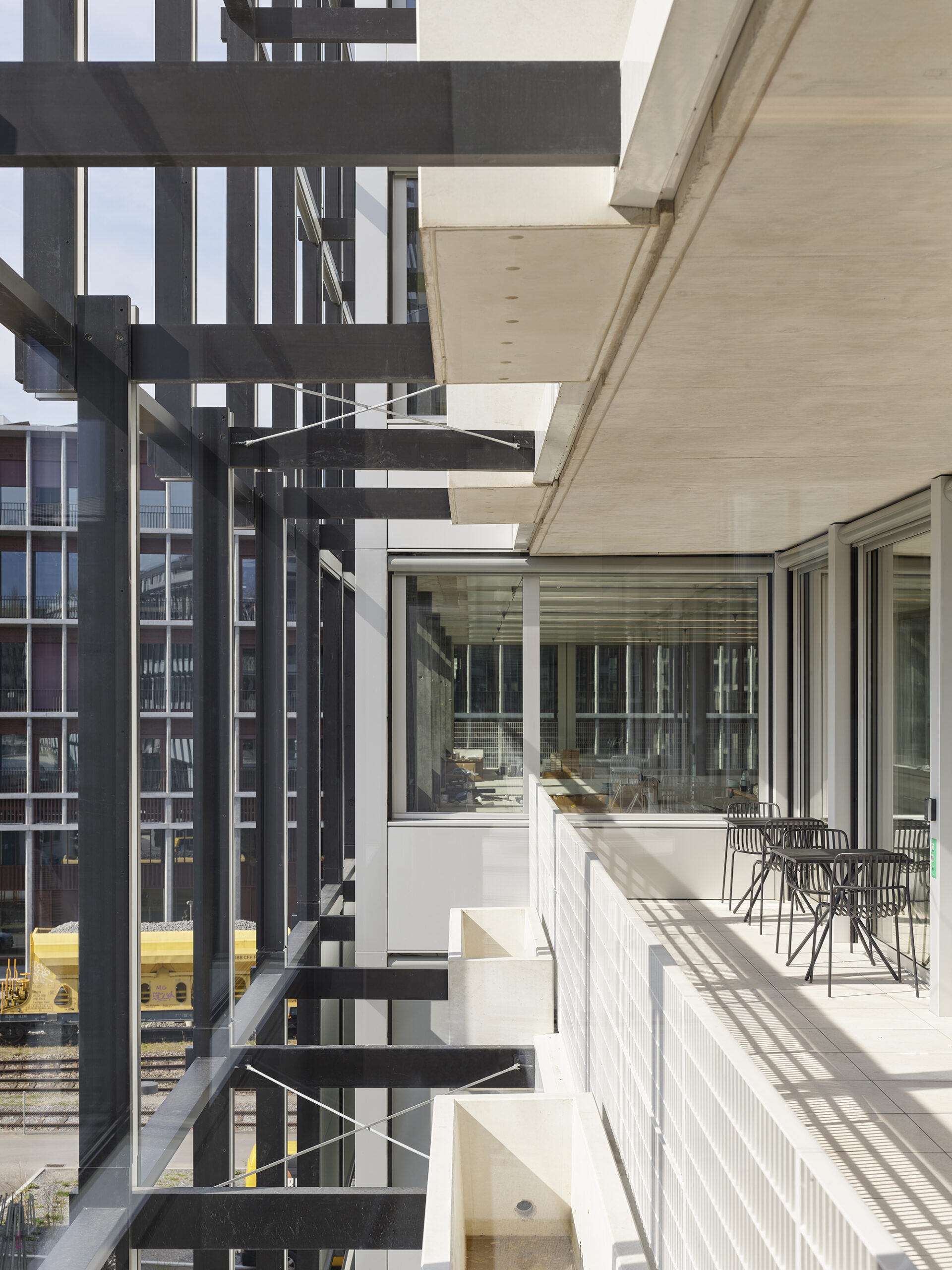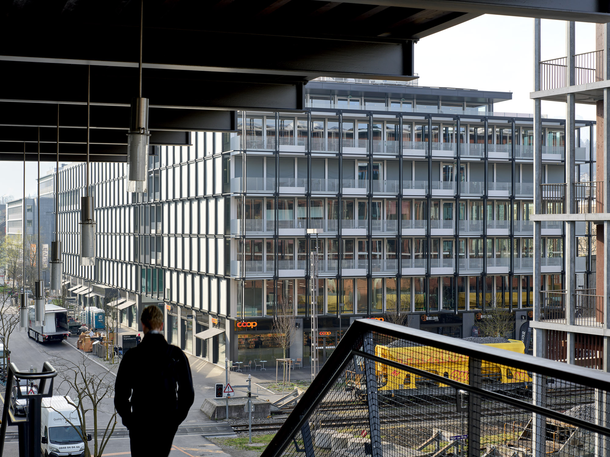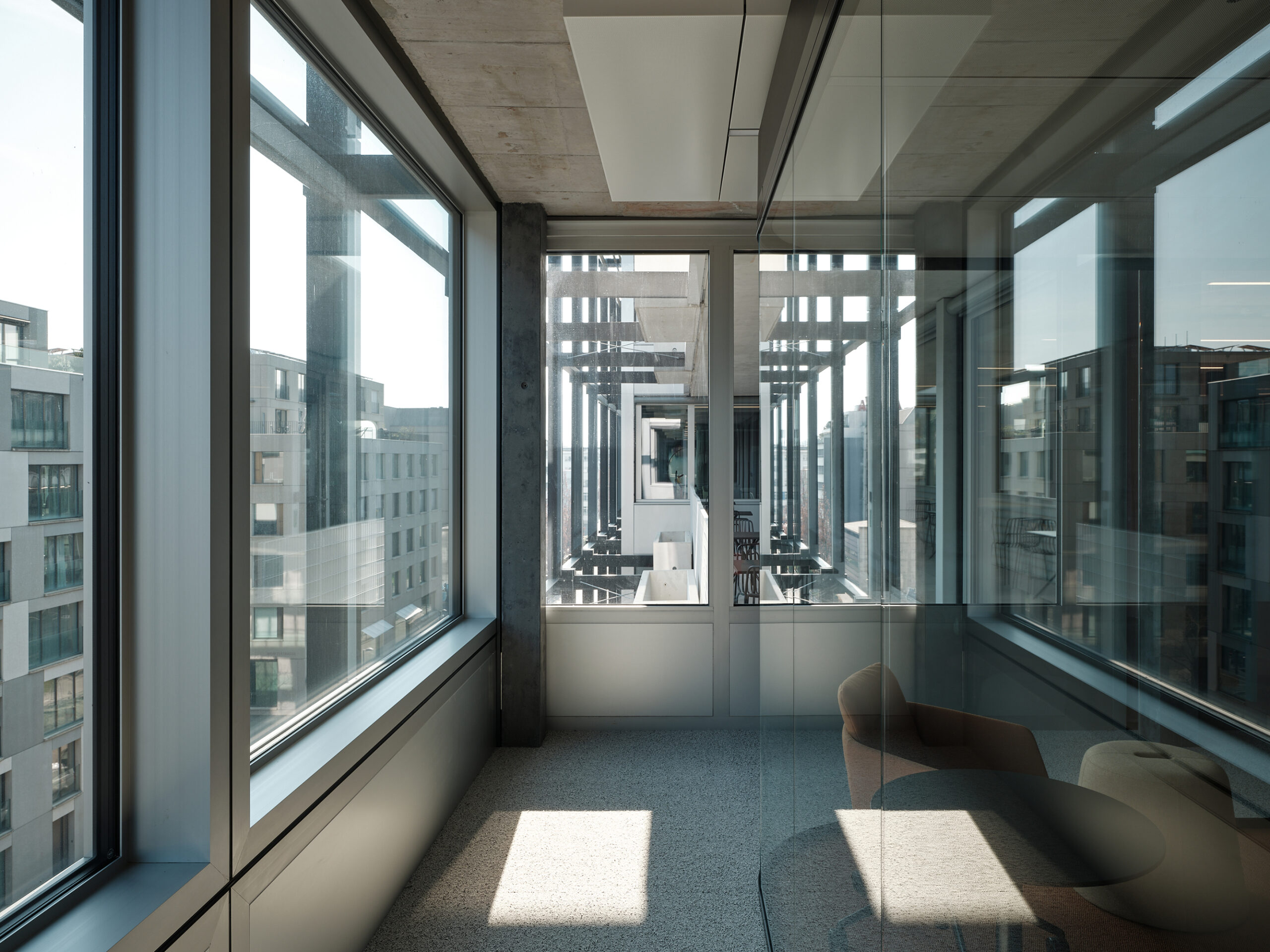 Bürokonzept: Bei der Entwicklung des Bürokonzepts wurde grossen Wert auf nutzungsspezifische Flexibilität sowie auf eine optimale Belichtung gelegt. Das Atrium belichtet die Mitte des Gebäudes, so dass Arbeitsplätze auch in der Nähe des Atriums angelegt werden können. Ein Fassadenraster von 2.70 Metern, kurze Erschiessungswege und eine einfache Leitungsführung ermöglichen es, die Büroflächen flexibel als Open Space oder als Einzelbüros zu nutzen.