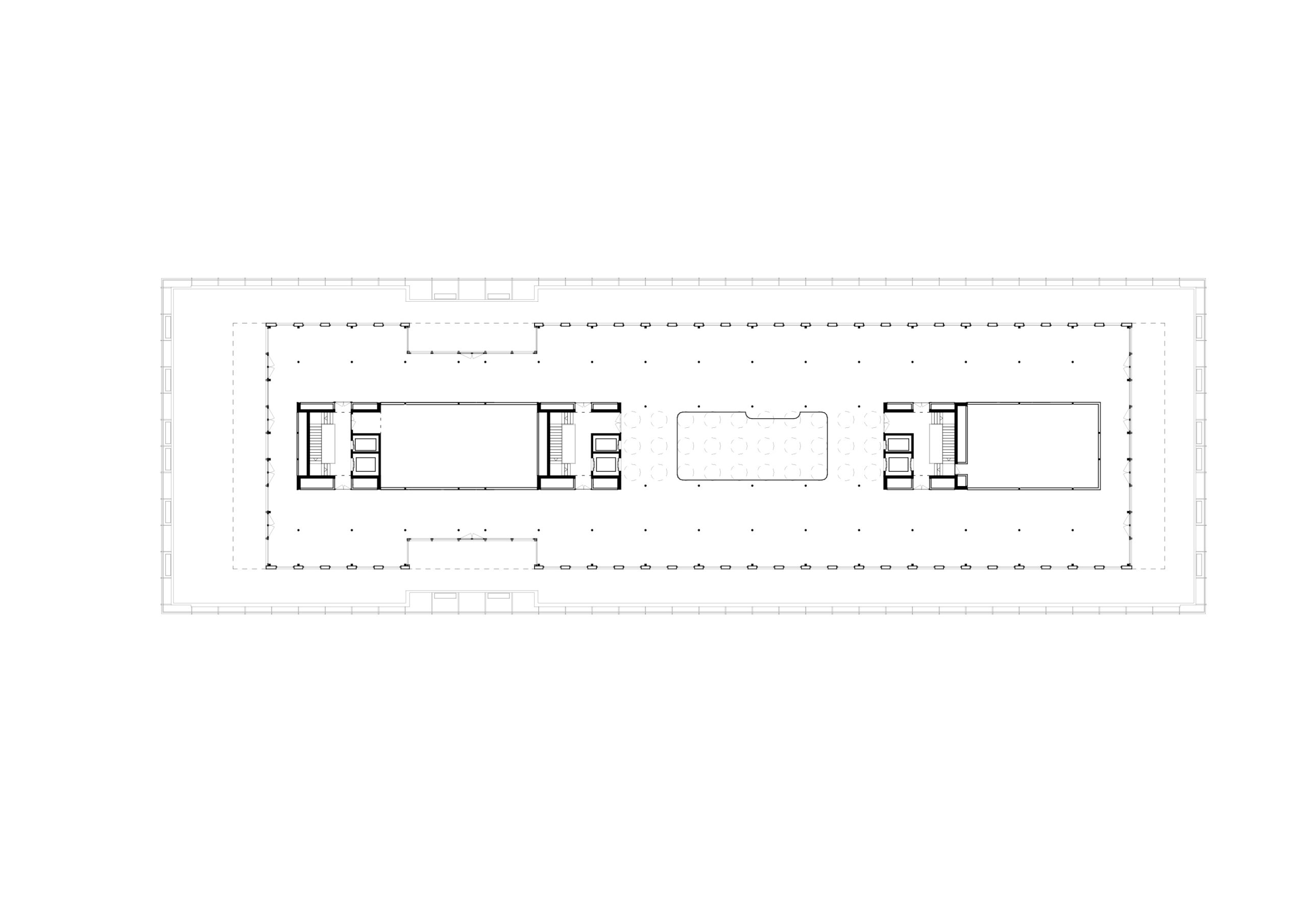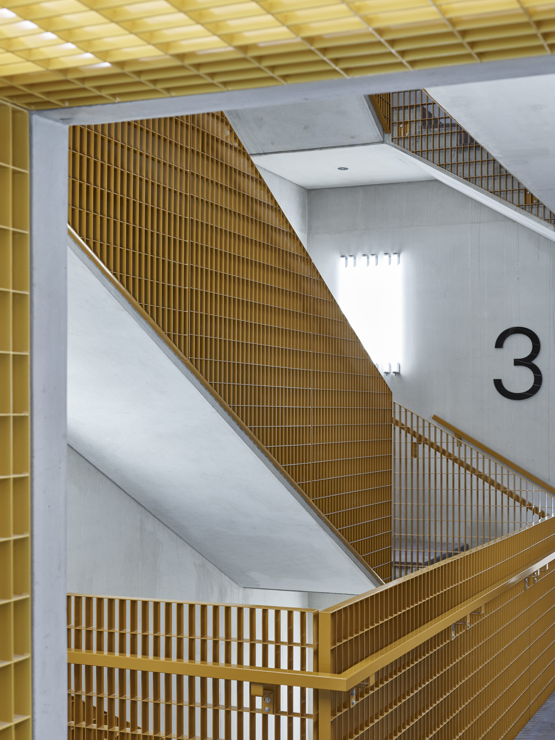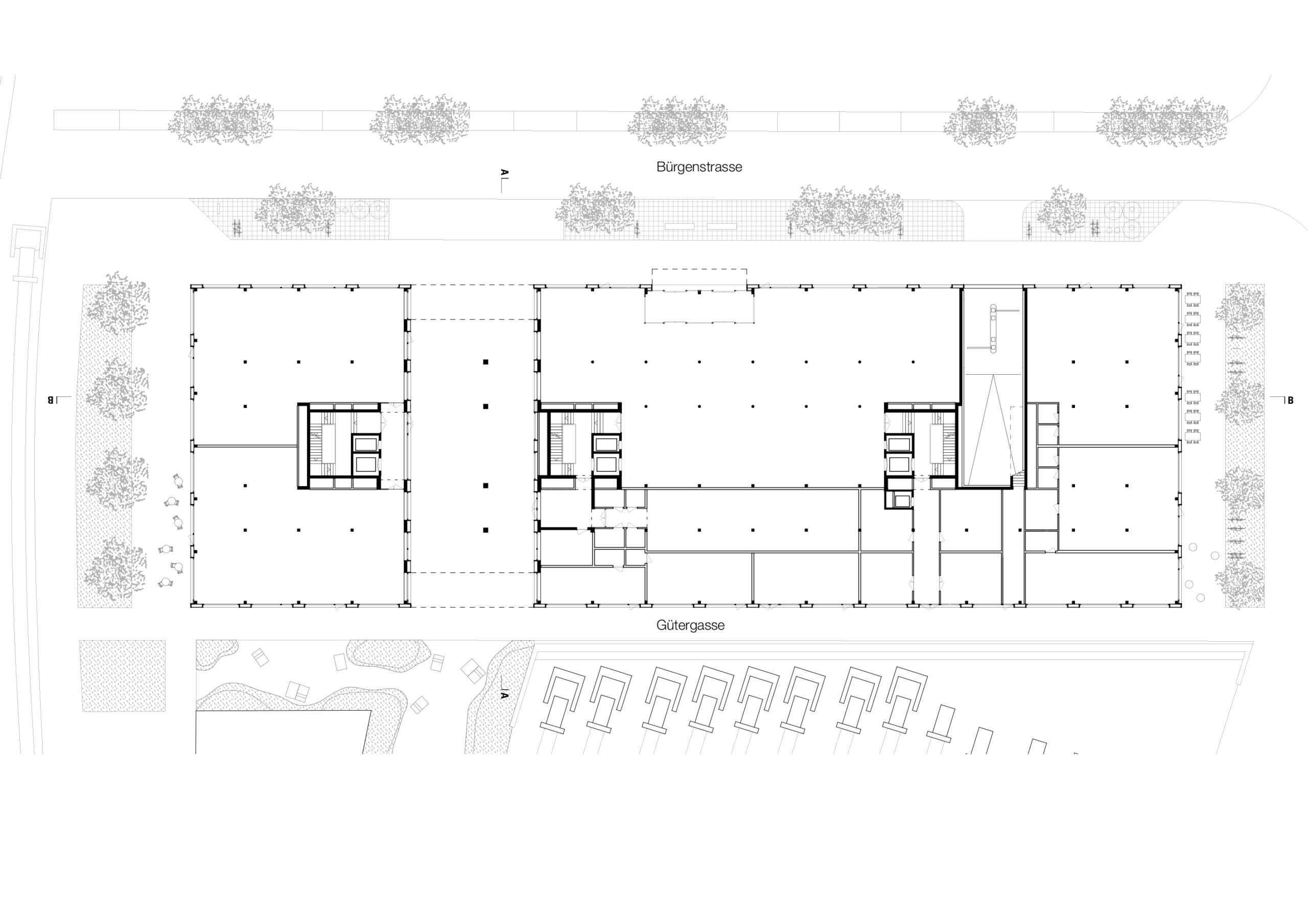 Drei in der Mittelzone gesetzte Treppenkerne strukturieren das Gebäude sowohl statisch als auch räumlich. Als betonierte Kerne verbinden sie sich mit dem Untergeschoss und bilden das Rückgrat des Gebäudes. Das eingeführte Stützenraster gewährleistet eine maximale Nutzungsflexibilität. Die Schnittstelle der beiden Gebäudeteile über dem Durchgang ist als flexible Schaltzone ausgebildet, die je nach gewünschter Nutzung dem einen oder dem anderen Gebäudeteil zugeschlagen werden kann. Eine gemeinsame Tiefgarage im ersten Untergeschoss erschliesst alle Treppenkerne, während im zweiten Untergeschoss mit kleinerem Fussabdruck alle Technikräume untergebracht sind.