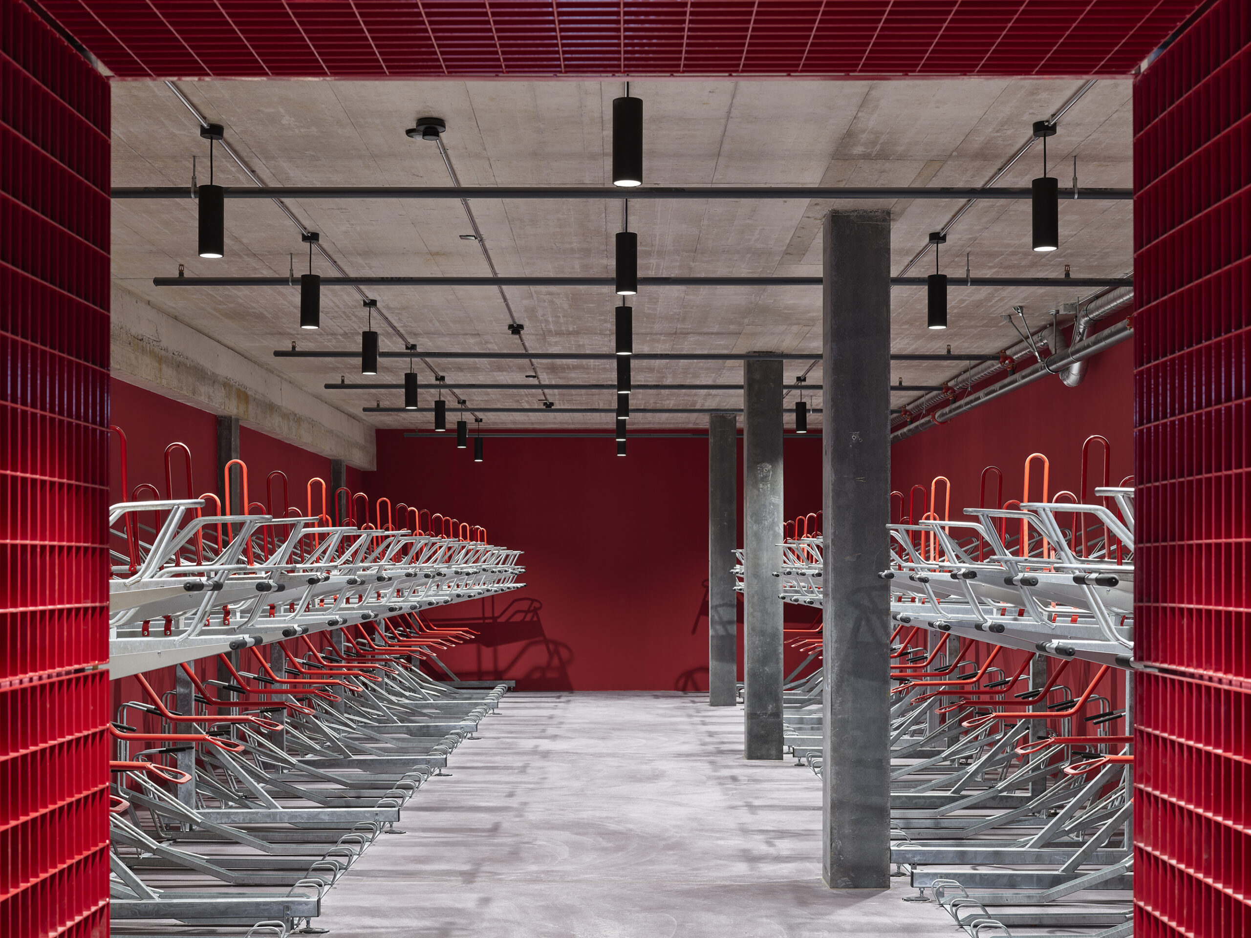 Eingefärbte Fassadenelemente aus Glasfaserbeton fügen sich zu einem geflochtenen Ganzen aus Gesimsen, Lisenen und Wandflächen, welches das Gebäude zu einem integrativen Glied des Gevierts werden lässt. Im Ausdruck verleiht eine feine Profilierung der Elemente dem Gebäude etwas Textiles, welches mit der Art der Fügung korreliert.