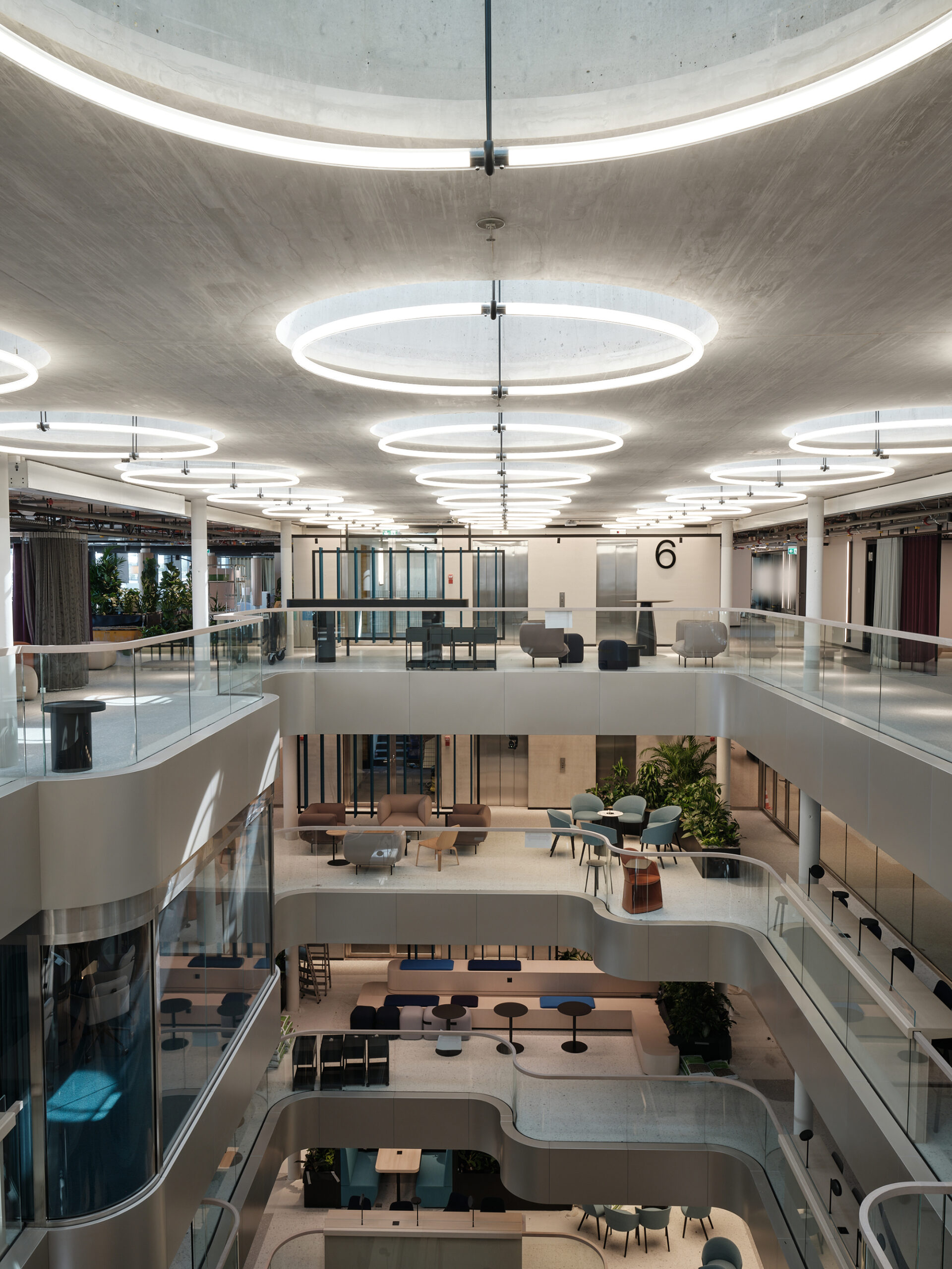 Atrium: Das Herzstück des Gebäudes C bildet das dahinter liegende Atrium, das hell und grosszügig ausgestaltet ist und über eine spiralartige Treppe alle Geschosse repräsentativ miteinander verbindet. Es liegt zentral im Gebäudeteil C, eingespannt zwischen den beiden Kerne, die mit Liften und Fluchttreppen ausgestattet sind. Diese sind jedoch so ausgebildet, dass sie zum Atrium hin grossflächig verglast sind, wodurch kurze Distanzen über die Geschosse hinweg einfach überwunden werden können. Als verbindende, repräsentative Vertikalerschliessung stellt das Atrium die visuelle und räumliche Verbindung über die Geschosse hinweg sicher und ermöglicht den Mitarbeitenden kurze Wege und eine gute Orientierung. Mit Steharbeitsplätzen und Lounge-Bereichen ausgestattet bietet sie zudem die Möglichkeit für den Informellen Austausch der Mitarbeitenden.