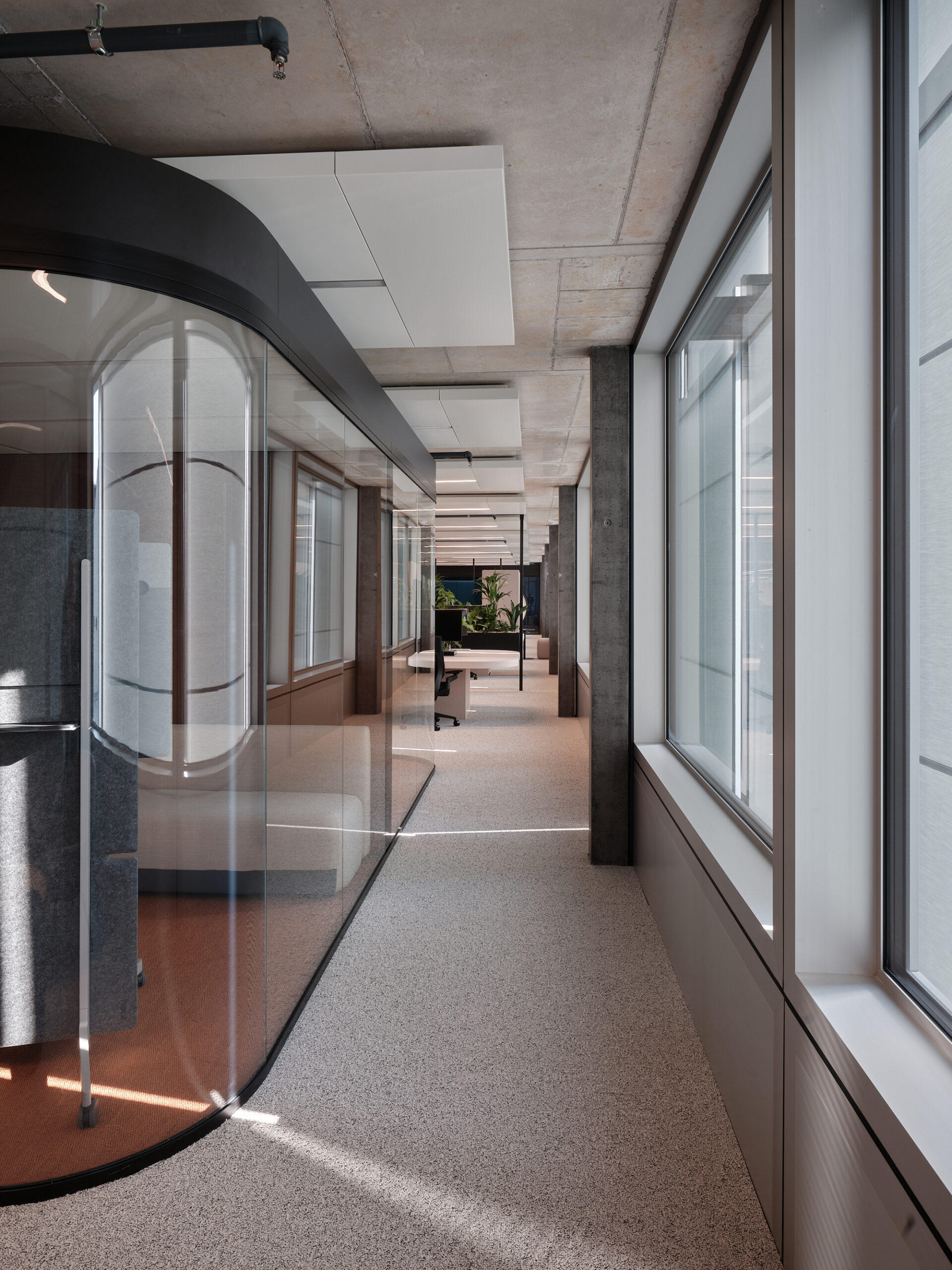 Das Bürolayout des Grossmieters basiert auf dem Konzept des „Activity Based Working“ und dem Leitgedanken „Your Office Is Where You Are“. Der gesamte Gebäudeteil des Hauptmieters ist so konzipiert, dass überall – im Atrium, auf den Balkonen, im Café, in der Bürolandschaft oder auf dem Dach des Attikageschosses – gearbeitet werden kann und soll. Die Mitarbeiter sucht sich dabei die für ihre Tätigkeit die gerade am besten geeignete Arbeitsumgebung aus; feste Arbeitsplätze gibt es nicht. Akustisch abgetrennte und mit einem Vorhang abtrennbare „Working Pills“ zonieren die Bürolandschaft in einzelne Neighbourhoods unterschiedlicher Grösse. Sie stehen für Telefongespräche, konzentrierte Einzelarbeit oder Meetings zur Verfügung und können individuell gebucht werden. Der Standort der „Working Pills“ innerhalb der Bürolandschaft ist flexibel. Er kann je nach gewünschter Grösse der Neighbourhood variiert werden.