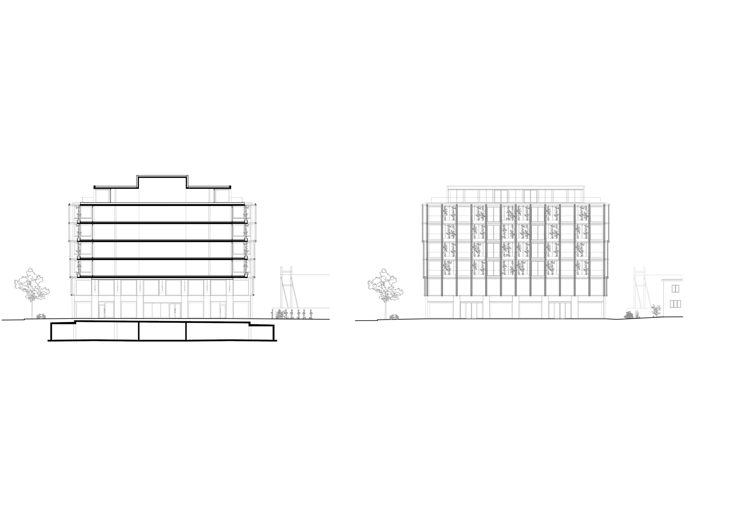 Das Gebäude wird auf seine Grundstruktur zurückgebaut, welche als generierendes Prinzip sowohl für die Fassaden als auch den Zuschnitt der Wohnungen massgebend ist. Durch die Bewegtheit der inneren Wände kann das für Wohnungsbau ungünstige Achsmass und starre Stützenraster umspielt werden. Bestehende Stützen werden in die neuen Wände integriert oder freigestellt. An der tiefsten Stelle des Langbaus ermöglicht der sich über vier Geschosse nach oben entfaltende Lichthof jeweils zwei Durchstosswohnungen. Deren Tiefe von beinahe 26 Metern wird dabei in einen mehrfach geknickten Bewegungs- und Aufenthaltsraum umgewandelt. Der Lichtkörper entwickelt sich über die Geschosse als Oblicht in überhohen Räumen hin zu einem raumhohen Lichthof. Ab dem dritten, respektive vierten Obergeschoss entstehen durch die Staffelung der Aufbauten zur Erika- und Bremgartnerstrasse vorgelagerte Terrassen. Eine gemeinsame Dachterrasse für den Kopfbau ergänzt dessen Wohnungen mit einem wertvollen Aussenraum. Die Hochparterresituation im Langbau wird in Form von Studios und Stadthausmaisonetten als Wohnraum genutzt, während sich im Erdgeschoss des Kopfbaus vier Gewerberäume zur Zentralstrasse hin adressieren.