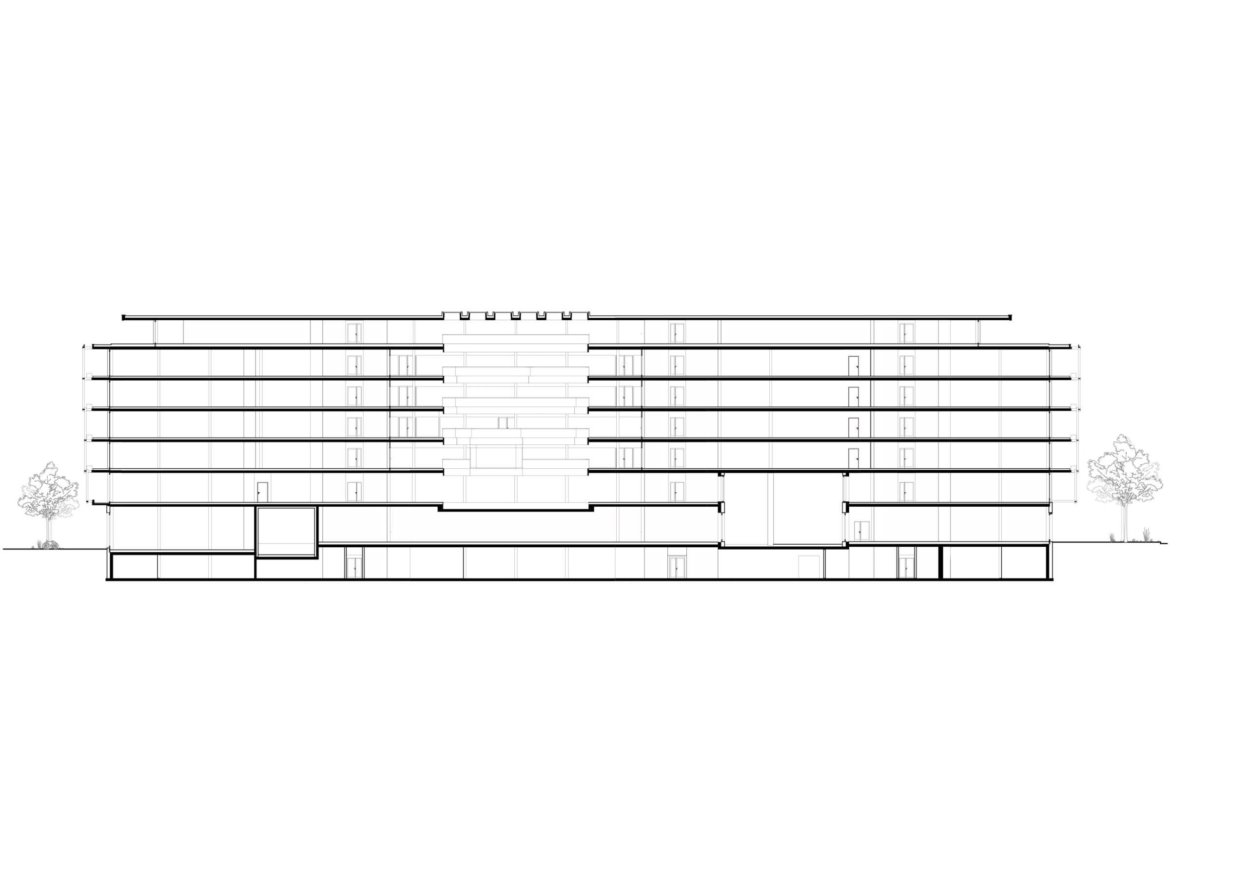 Als Auftakt für das Quartier Rösslimatt fasst der neue Stadtbaustein die Baufelder B und C zu einem einzigen, differenzierten und vielschichtigen Gebäude zusammen. Gleichermassen robust und einladend im Sockelbereich wird der öffentliche Anspruch des Gebäudes markiert. Die darüber liegenden Bürogeschosse werden von einem Kleid aus Metall und Glas umhüllt und stellen den Austausch einer modernen Arbeitswelt zwischen innen und aussen her. An ausgezeichneten städtebaulichen Stellen zieht sich die Bürofassade zurück und schafft begrünte, klimatische Pufferzonen. Wie Köpfe und Taillen helfen sie, das Gebäude zu zonieren, ihm einen Massstab zu geben und im Quartier zu verankern. Während die durchgängigen Balkone an den Stirnseiten Blicke zur Allee und in den Park freigeben, leiten die Einzüge die Fussgänger durch die zweigeschossige Passage.
