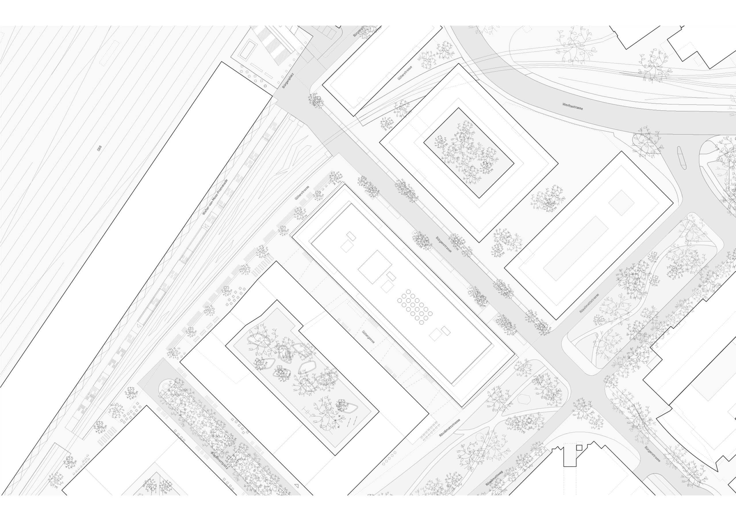 Auf dem Areal eines Maisfeldes nahe dem Zentrum von Regensdorf soll ein neues Quartier mit 340 Wohnungen sowie kleinen Gewerbeeinrichtungen entstehen. Das Areal liegt eingespannt zwischen dem Ortskern und grossmassstäblichen Anlagen: Ein Shoppingcenter im Süden und ein Gefängnis im Osten. Es wurde eine Bebauungsstruktur gesucht, welche die Vorzüge von städtischen Räumen mit jenen des Landes vereint.Der Bebauungsvorschlag – inspiriert von europäischen Vorbildern der Gartenstadt – stellt eine Identität stiftende Grossform dar, welche die Räume sensibel hierarchisiert und dabei öffentlichere und intimere Räume schafft.Generierendes Element des neuen Quartiers ist ein zentraler Platz, der von einer doppelwandigen Gebäudekruste umschlossen wird. Er weist zwei diagonal versetzte Hauptzugänge auf, welche die Strassenkreuzung im Südosten mit der dörflich belebten Watterstrasse im Nordwesten verbinden. Zu den stark befahrenen Strassen im Süden und Osten zeigt sich die Kruste als kompakter Riegel, der das Geviert vom Strassenlärm abschirmt. Entlang der Flanke zum kleinkörnigeren Zentrum fächert sich die Kruste in einzelne, villenartige Gebäudekörper auf, die durch einen neu angelegten Ringweg erschlossen werden. In der Kruste selbst sind ruhige Gartenhöfe angelegt.An der nordöstlichen Ecke des Gevierts zieht sich die Kruste zurück und erlaubt so eine Erweiterung des bestehenden Parks, womit gleichzeitig die Wohnlage zum lauten Ostring hin entschärft wird. An der südöstlichen Strassenkreuzung wirkt ein vorgelagerter städtischer Platz als Verbindungsglied zwischen dem neuen Quartier und den weiteren Wohnquartieren Regensdorfs.